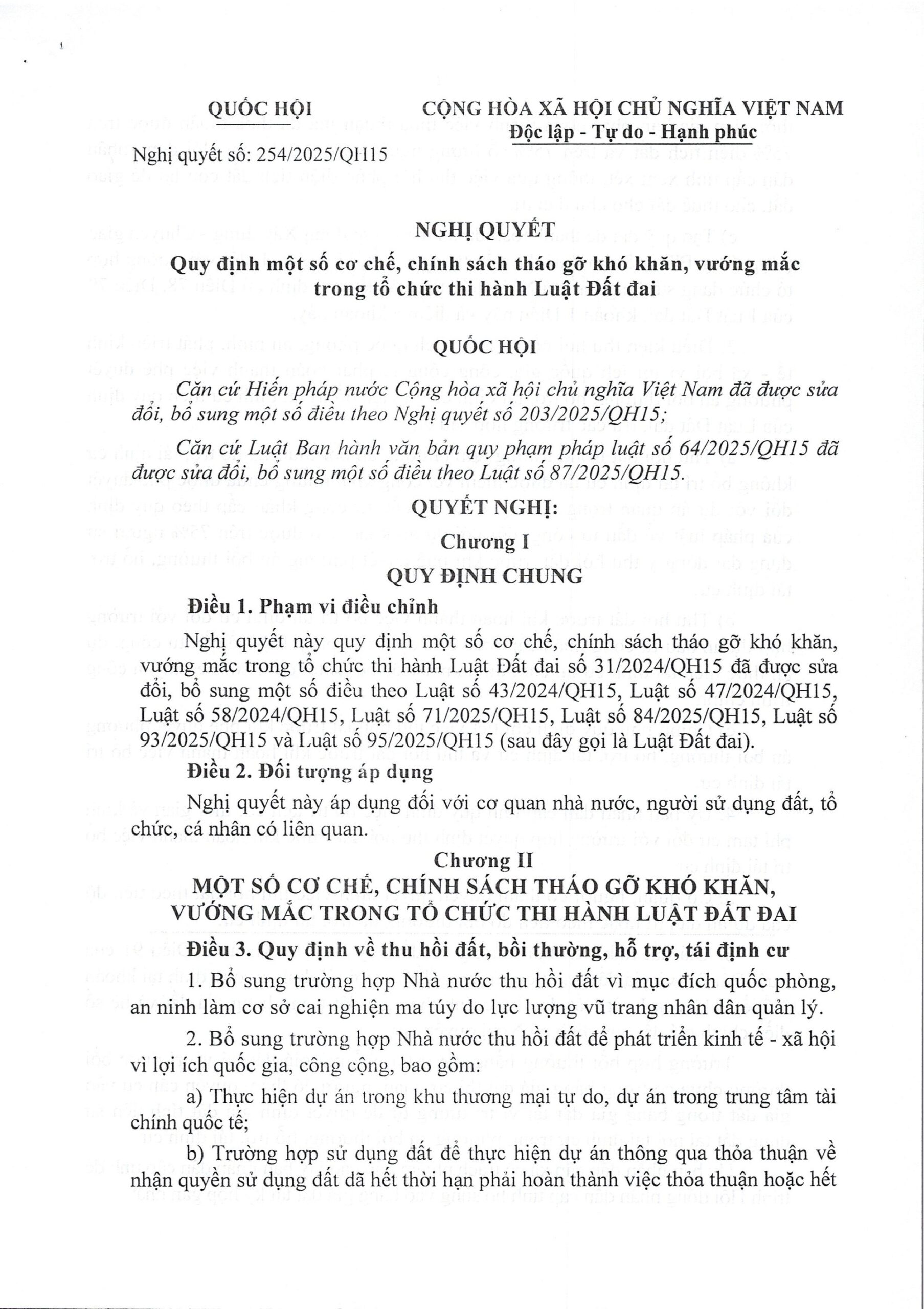 Nghị quyết 254/2025/QH15 của Quốc hội, trong đó minh bạch hóa cơ chế bồi thường khi thu hồi đất, nới điều kiện tách thửa, hợp thửa; làm rõ nghĩa vụ tài chính khi chuyển mục đích sử dụng đất; mở rộng các trường hợp được cấp “Sổ đỏ” lần đầu.